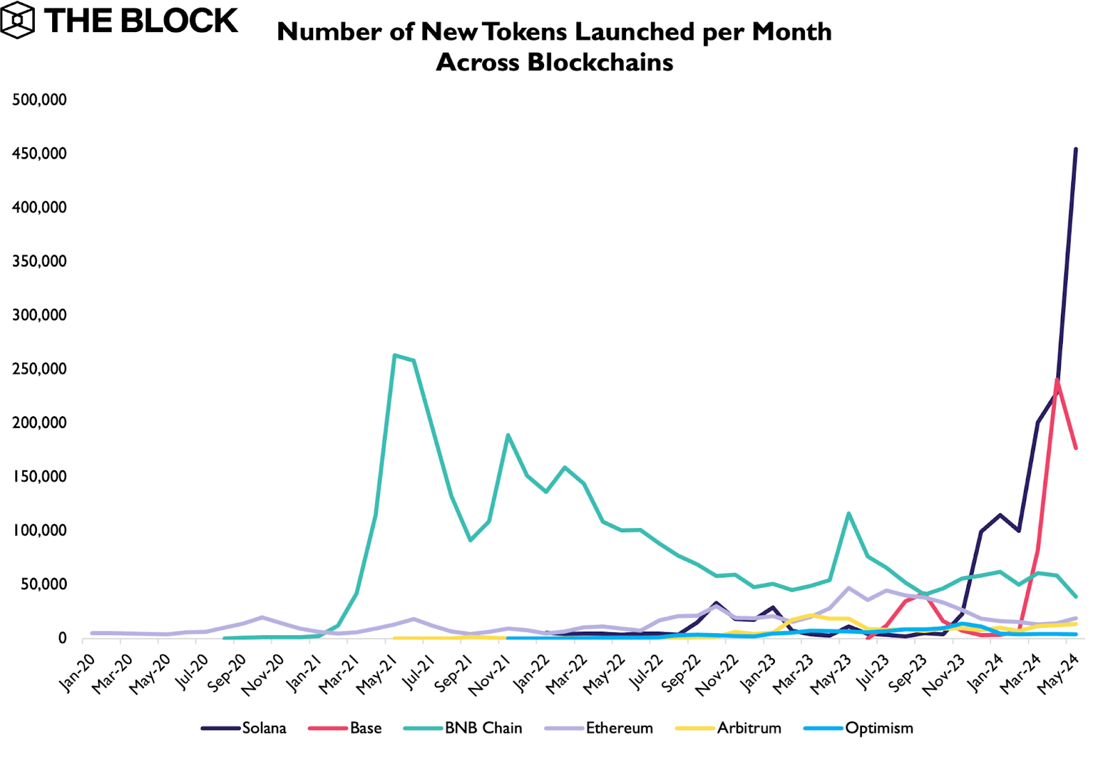 Solana continues to be the biggest platform for memecoins, with close to 500,000 new tokens launched in May alone—that’s the highest number recorded by The Block, and far beyond the numbers of rival blockchains