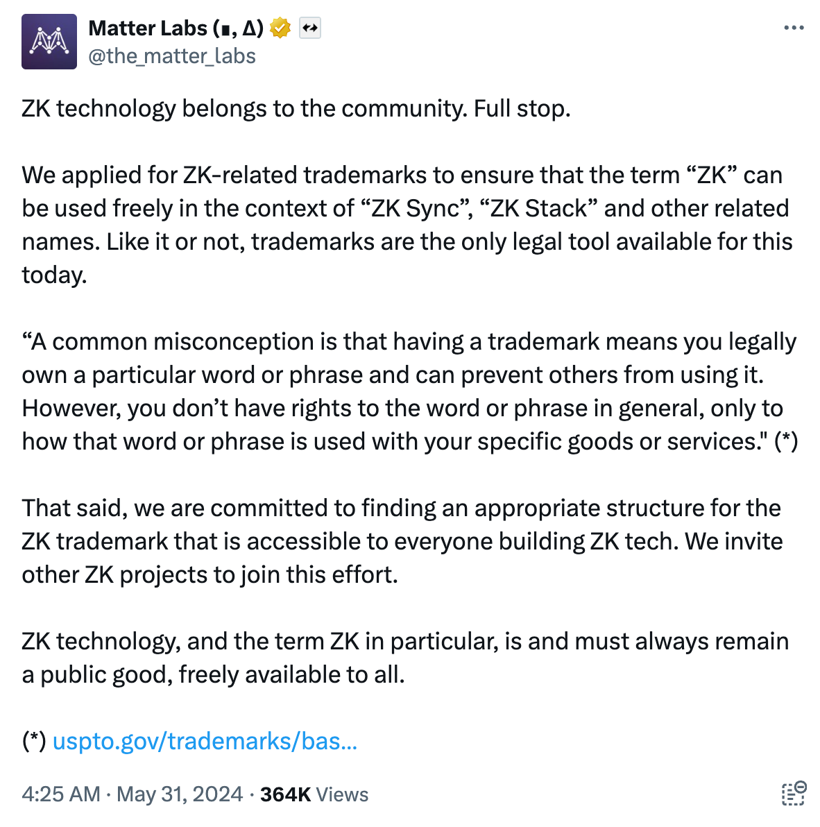 Gluchowski referenced the fact that Matter Labs had “earlier reached out to the legal team of the Ethereum Foundation and offered to cooperate on creating a legal framework to make the use of “ZK” and similar important tech terms in the public domain.”