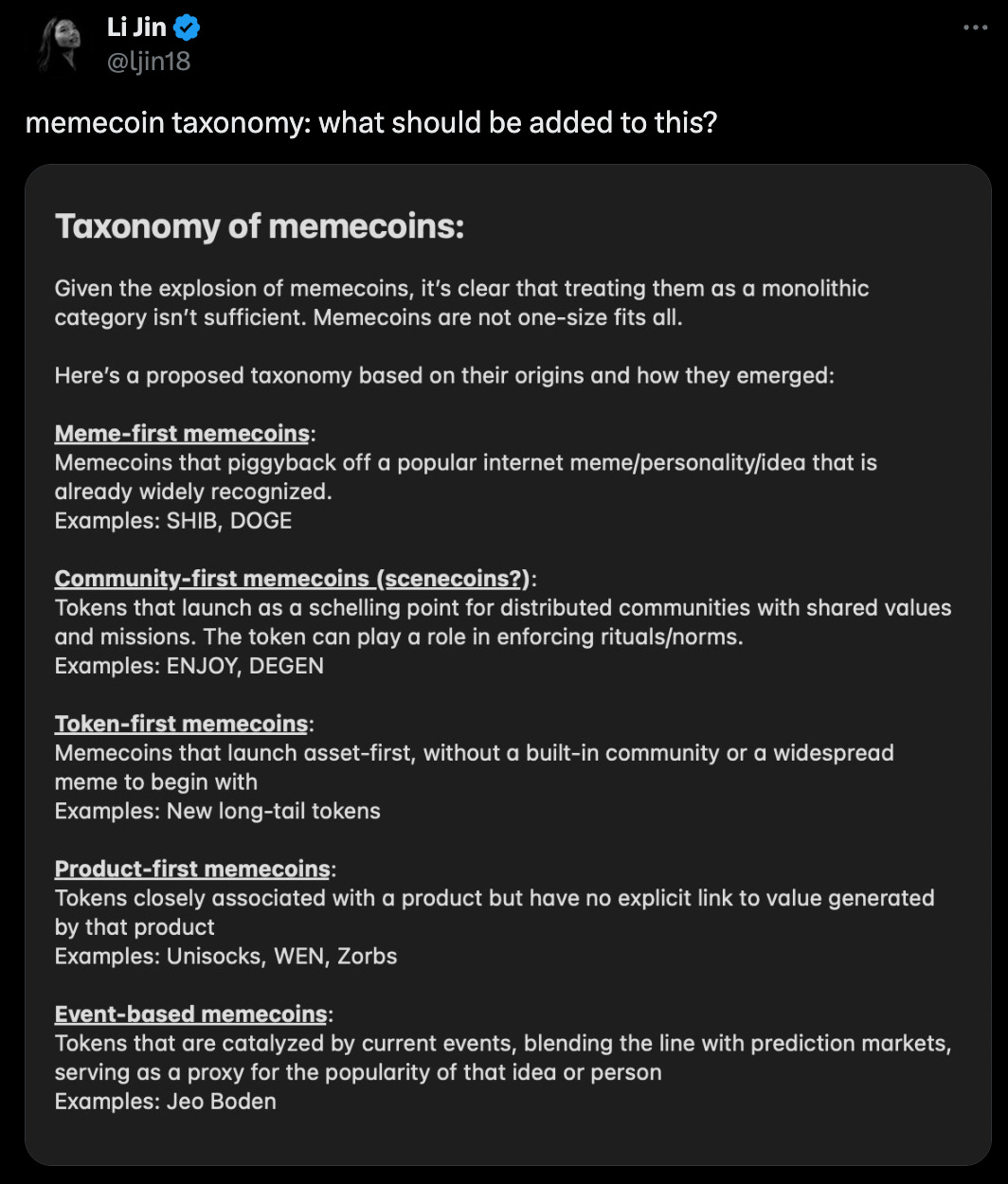 NFTs haven’t worked so well for brands—as we explained with the closure of Starbucks’ Odyssey collection—and it is unlikely we will see brands diving into memecoins with its lack of regulatory clarity in the US right now. But there’s certainly plenty to assess, with Jin herself breaking memecoins themselves out into distinct categories.