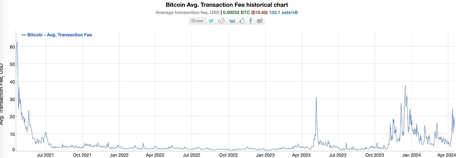 Halvings tend to be a tense affair. Past events have been preceded by a sizeable drop in Bitcoin price in the months leading up and general negativity, This time around, the price drop is smaller (less than 20%) and there’s noticeably more positivity due to new factors: Bitcoin ETFs, which have unlocked $100 billions in new trading volume, and excitement around newfound utility of the Bitcoin blockchain.