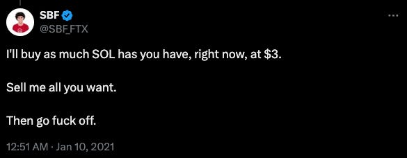 A self-confessed Solana fanboy, Bankman Fried created a decentralized exchange in 2020 called Serum that was based on the Solana Network. But he was banging the SOL drum long before. In a January 2021 tweet that went viral, Bankman Fried argued with a high-profile trader who criticized Solana’s technical merits. The exchange illustrated his confidence and, given his profile at the time, appeared to anoint Solana as a Web3 firm to watch.