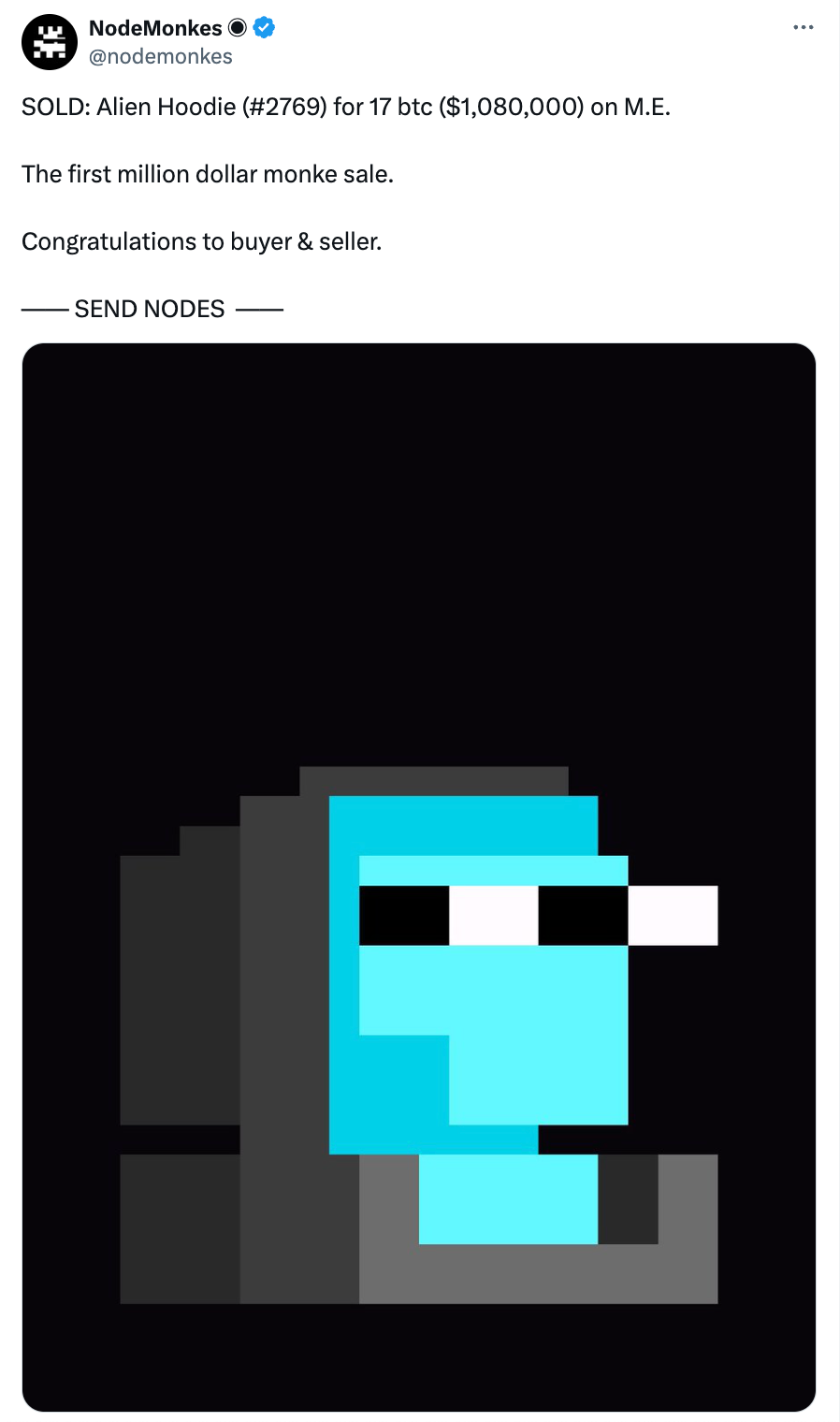Also in Bitcoin-land, the NFT market for BTC is charging with Bitcoin-based NFTs out-trading those of Ethereum. Notably, Bitcoin-based NFT collection NodeMonkes saw its first $1 million sale—that’s based on Bitcoin Ordinals, the controversial project to “make Bitcoin fun again”