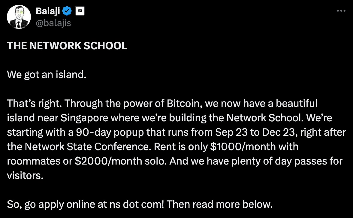 The concept is tightly aligned with Web3 and its core concepts of decentralization, freedom from national government policy and democratization of information. The conference took the concept to a new level, but it is poised to move even further forward with The Network School, a program that Srinivasan will run for three months on an island in Southeast Asia.