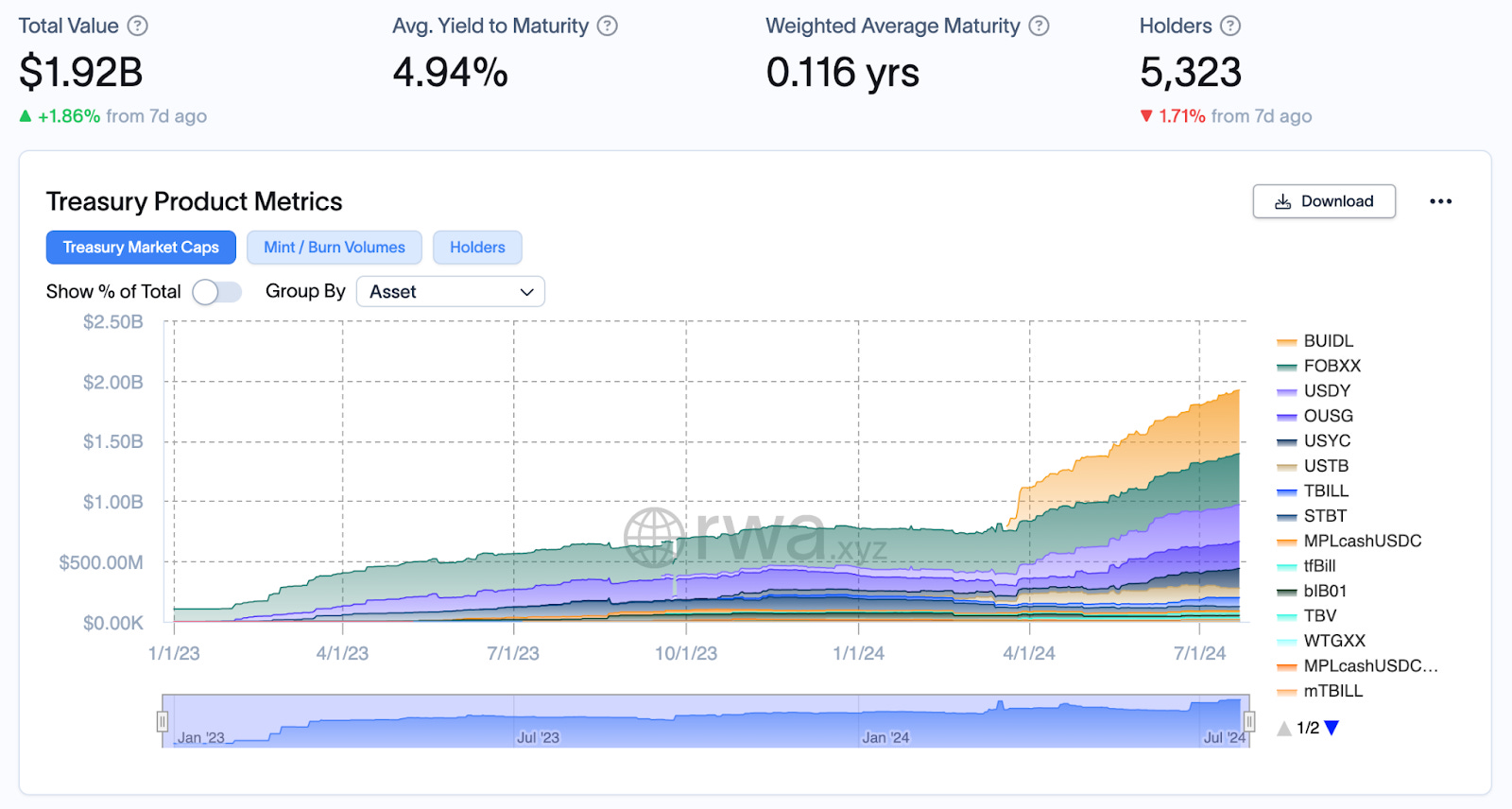 We wrote about tokenized treasuries in February and today, just over six months later, the total value of assets within tokenized funds has more than doubled from $860 million to $1.92 billion. A large part of that increase came from the launch of BlackRock’s BUIDL (BlackRock USD Institutional Digital Liquidity Fund) which reached $500 million in assets in early July to become the largest tokenized fund in the world.
