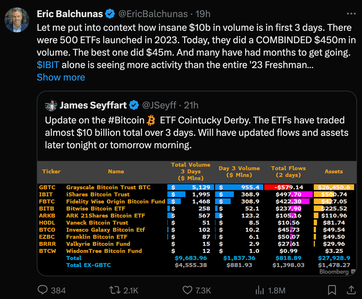The advent of ETFs is a boon for institutions that want to park a fraction of their assets in a high-growth alternative asset like Bitcoin, while it also gives crypto further legitimacy via billions in new capital from institutional and professional investors. The new US ETFs did $4.8 billion in trading collectively on their first day. That’s more than double the previous opening-day record, and it added around 10% to Bitcoin’s usual daily trading volume.