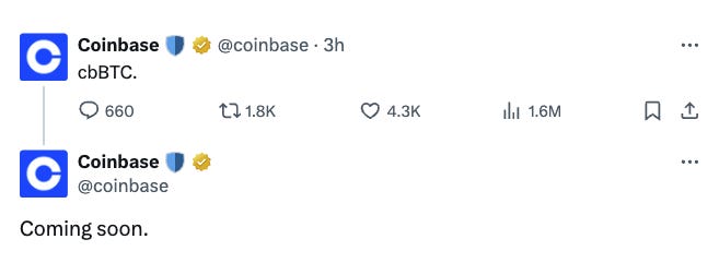 Jesse Pollak, the executive who leads Base, said he wants to build “a massive Bitcoin economy” on the chain. Its own take on WBTC would be a logical place to start, but you can imagine that Coinbase has a lot more planned beyond that.